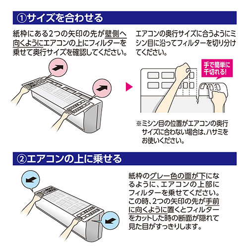 ●この製品を取付けてエアコン本体に次のような異常が発生した場合には使用をおやめください。①水滴や水漏れが発生した場合 ②異常な音が発生した場合 ③本体や室外機が止まった場合 ④機器の効果がなくなった場合 ●この製品を取付けることで、すべてのホコリをとるわけではありません。●エアコンの真下とその周辺にストーブやファンヒーターなどの熱を持つ暖房器具を設置している場合、フィルターが落下した際に接触するおそれがありますので暖房器具はエアコンから離れた場所でご使用ください。●エアコン上面に傾斜がついている機種にご使用された場合、フィルターが落下することがあります。●サーキュレーターをご使用の場合、風向きによってはフィルターが落下することがあります。●リモコンがうまく作動しない時は、リモコンの受信パネル部分だけカットしてください。●機器のサイズ・形状により取付けできない場合があります。パッケージ記載事項をよく読んでから使用してください。●取替え目安は1〜2ヶ月です。ただし、エアコン本体の吸気能力が落ちた場合は、ホコリでフィルターが目詰まりしている可能性があるため交換目安に関わらずフィルターを交換してください。●水洗いできません。●ゴミとして処理する場合は、お住まいの自治体の区分に従ってください。●使用目的以外の使用はしないでください。