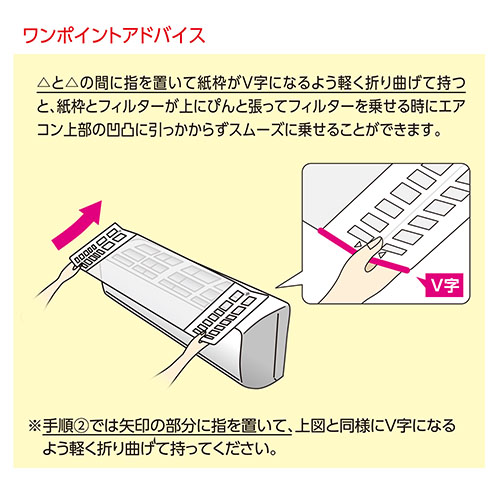 ●紙枠付きのフィルターなので、奥まで手の届きにくいエアコンへの取付けも「サッと置くだけ」で簡単に行えます。