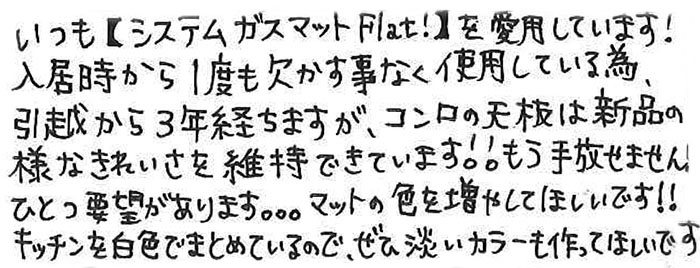 いつも「システムガスマットFlat!」を愛用しています!入居時から一度も欠かす事なく使用している為、引越から3年経ちますが、コンロの天板は新品の様なきれいさを維持できています!!もう手放せません!ひとつ要望があります…マットの色を増やしてほしいです!!キッチンを白色でまとめているので、ぜひ淡いカラーも作ってほしいです