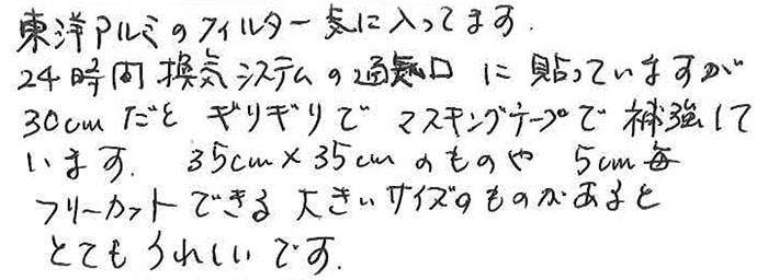 東洋アルミのフィルター気に入っています。24時間換気システムの通気口に貼っていますが30cmだとギリギリでマスキングテープで補強しています。35×35cmのものや5cm毎フリーカットできる大きいサイズのものがあるととてもうれしいです。