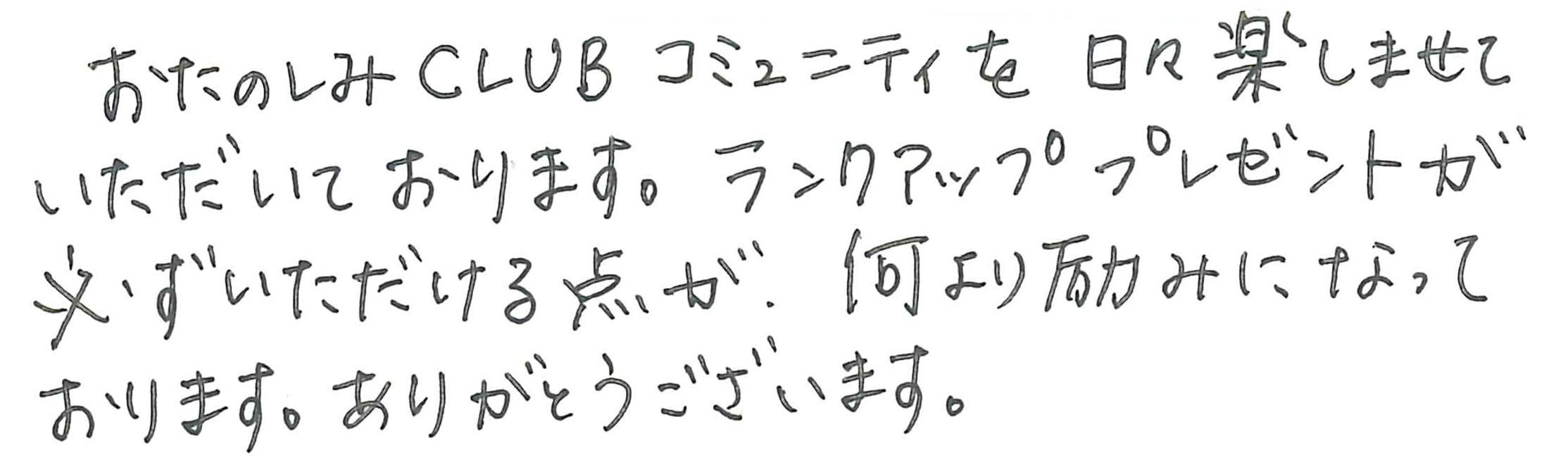 おたのしみCLUBコミュニティを日々楽しませていただいております。ランクアッププレゼントが必ずいただける点が何より励みになっております。ありがとうございます。