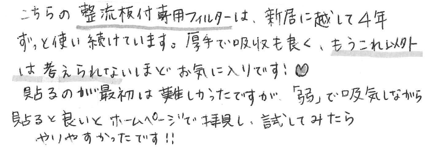 こちらの整流板付専用フィルターは、新居に越して4年ずっと使い続けています。厚手で吸収も良く、もうこれ以外は考えられないほどお気に入りです!貼るのが最初は難しかったですが「弱」で吸気しながら貼ると良いとホームページで拝見し、試してみたらやりやすかったです!!
